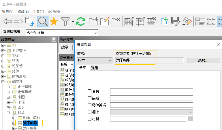「在編輯器中尋找」:「資源中心編輯器」對話方塊隨即開啟,並顯示資源中心資源庫中的零件位置。
