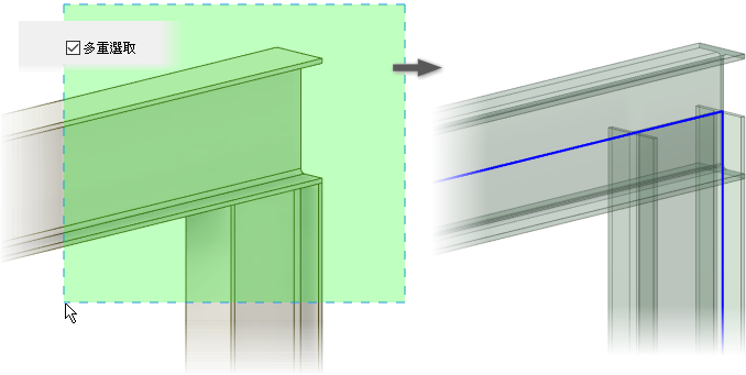 先前,使用「變更」指令時,無法使用窗選。現在已啟用窗選,您可以使用「多重選取」選項同時選取多個構件。