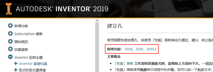 此外,使用 F1 取得說明頁面時 (如果適用),您將在頁面頂端看到連至〈新增功能〉主題的連結,該主題說明了特徵或指令發生的變更。