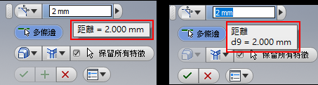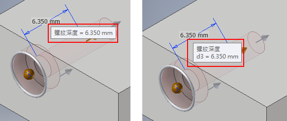 對於「孔」指令,在您輸入值時,如果值無效 (例如,指定的螺紋長度大於孔深度),值顏色會變為紅色,並且工具提示會報告值無效。這可讓您立即更正該值,或找到需要編輯來讓該值有效的其他值。如果值有效,值顏色為黑色。
