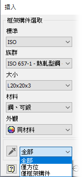 使用「插入」和「變更構件」指令時,您現在可以從既有框架構件複製資訊。在對話方塊中選取滴管,以啟用「複製性質」,然後選取一個構件。您可以選擇僅複製框架構件資訊、僅複製方位資訊,或同時複製兩者。