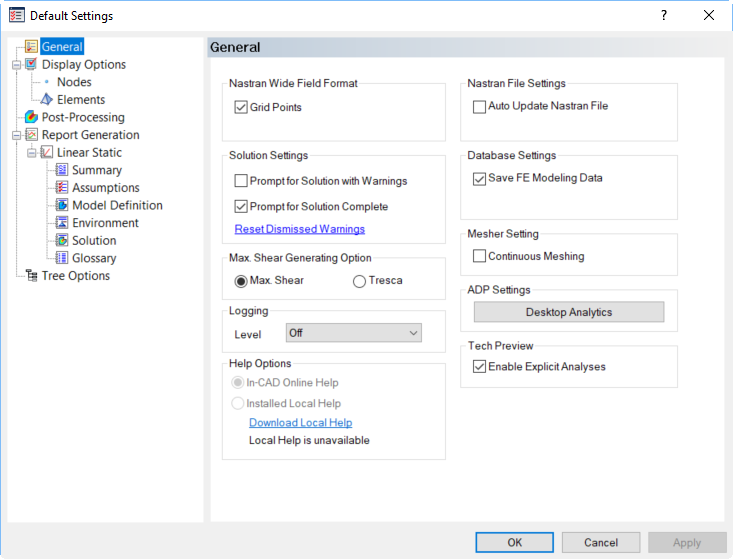一般 - 允許使用者設定 Nastran 欄位格式,以及關於求解、記錄、說明、資料庫、檔案、網格產生器、ADP 和技術預覽的各種設定。