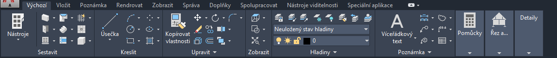 Karta Výchozí obsahuje příkazy, které jsou v rámci aplikace nejčastěji používány. Nacházejí se zde základní nástroje objektů, výkresů a také často používané pomůcky, jako například nástroje úprav, hladiny a základní poznámky. Karta Výchozí slouží v novém výkresu jako výchozí bod.