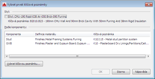 zobrazí se dialog Vybrat prvek klíčové poznámky. - Pokud chcete opatřit komponentu objektu klíčovou poznámkou, vyberte sloupec Komponenta a klikněte na tlačítko OK.
