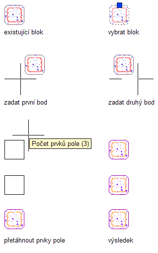 Tento postup se používá k vytvoření pole identických skic (například šrafování a křivek), architektonických objektů (například dveří a stěn), polygonů AEC nebo objektů založených na profilech (například vysunutí objemových prvků a prostorů). Můžete také vytvořit pole z libovolného obsahu (včetně komponent detailů) vytvořeného z těchto typů skic a objektů.