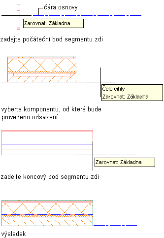Umístění segmentu stěny změníte v průběhu jeho kreslení tak, že zadáte odsazení na základě plochy nebo středu komponenty stěny, nebo na celkovém středu stěny. Při zadání možnosti odsazení a přesunování ukazatele myši přes segment stěny se zobrazují pomocné čáry s nápovědou, které označují, jaká část konkrétní komponenty stěny je vybrána. Plná čára označuje plochu komponenty, čárkovaná čára označuje střed komponenty a osová čára označuje celkový střed stěny.