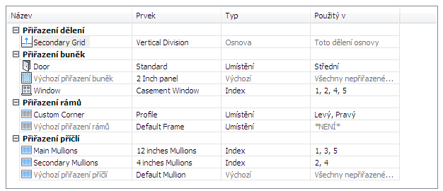 Po vytvoření definic prvků pro styl obvodového pláště, můžete tyto definice přiřadit ke každému z typů prvků obvodových plášťů: dělením, výplním buněk, rámům a příčlím.