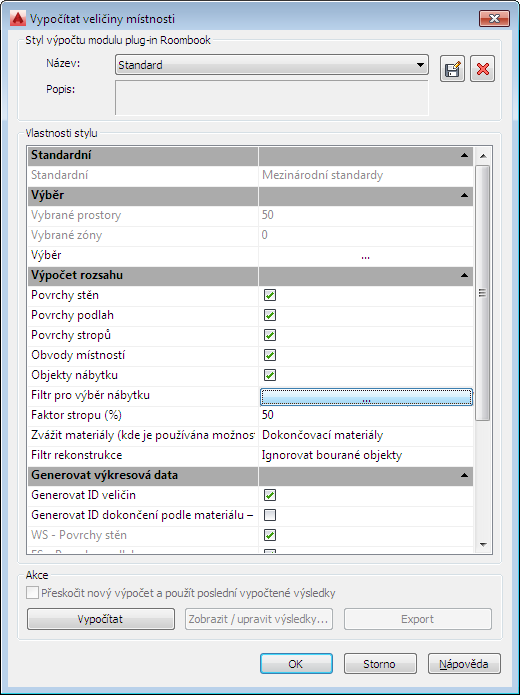 - Pokud jsou do výkresu přidány nové styly a definice až po provedení výpočtu veličin místnosti, tato možnost určuje, že tyto nové styly a definice budou automaticky zahrnuty do následujícího výpočtu. Ve výchozím nastavení je tato možnost zapnuta.