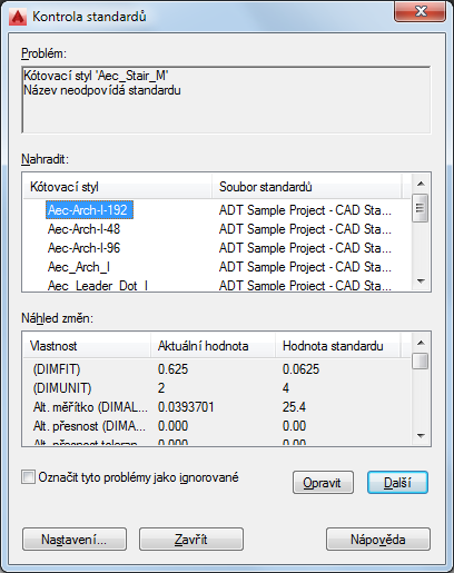 V nabídce Problém je uveden první kótovací styl, styl textu, hladina nebo styl typu čáry, který je neshodný s projektovými normami aplikace AutoCAD.