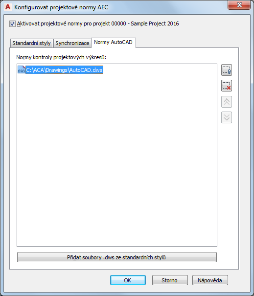 Použijte tento postup pro nastavení norem aplikace AutoCAD v projektu.