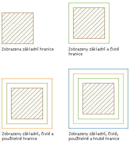 Ve výchozím stavu se zobrazuje pouze základní hranice prostoru. Chcete-li zobrazit nebo upravit čistou, použitelnou a hrubou hranici, může být nutné nastavit jejich zobrazované komponenty jako viditelné.