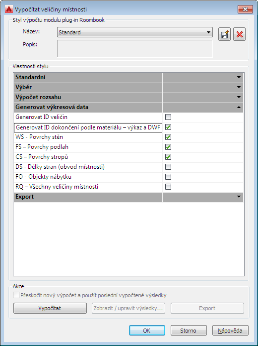 - V dialogu Vypočítat veličiny místnosti vyberte v části Vlastnosti stylu v seznamu Generovat data výkresu možnost Generovat ID konečné úpravy podle materiálu.