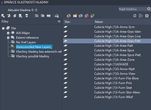 Když kliknete na odkaz, otevře se Správce vlastností hladiny a automaticky se vybere filtr Nesjednocené nové hladiny. Nové hladiny, které byly přidány do výkresu nebo do připojených externích referencí, jsou zobrazeny v seznamu.