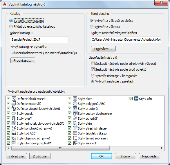 Tímto postupem je možné vytvořit nový katalog nástrojů založený na existujících standardech ze stylů jednoho nebo více výkresů.