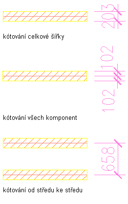 | Tloušťka stěny:Střed | Kótuje středovou čáru stěny s jednou komponentou nebo více komponentami |