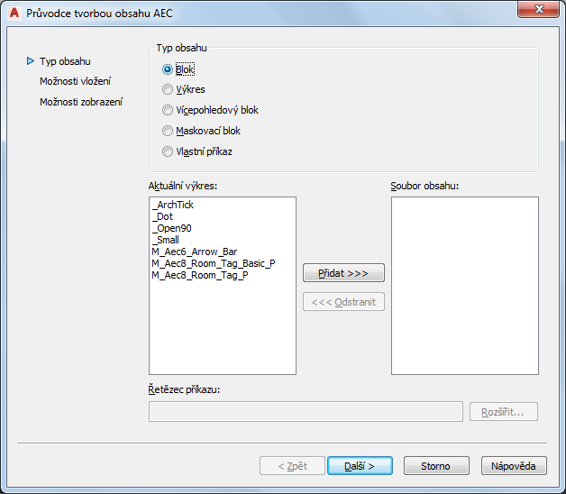 Jakýkoliv obsah na základě symbolu s výjimkou odkazů, poznámek a značek názvů by se měl vytvářet pomocí Průvodce obsahu AEC a ukládat jako obsah AEC tak, aby byl přístupný buď prostřednictvím karty „Obsah AEC“ v Design Center, nebo pomocí paletového nástroje.