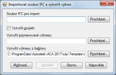 Při importu souboru IFC zadáte název výkresu na nejvyšší úrovni, který bude z tohoto souboru IFC vytvořen. Tento výkres obsahuje pouze externí reference. Pokud například importujete soubor IFC a pojmenujete jej Malá kancelářská budova, vznikne soubor DWG s názvem Malá kancelářská budova.dwg, který bude obsahovat všechny externí reference odpovídající jednotlivým částem struktury projektu obsažené v souboru IFC. Během importu dochází k těmto akcím: