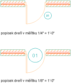 Na následujícím obrázku je znázorněn štítek dveří ve dvou různých měřítkách poznámek a v různém umístění na základě měřítka poznámek a základního bodu.