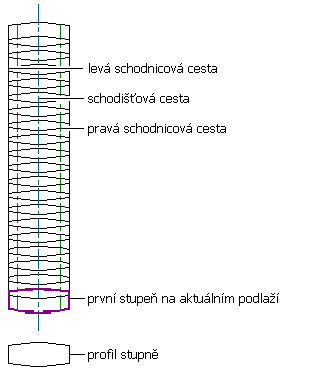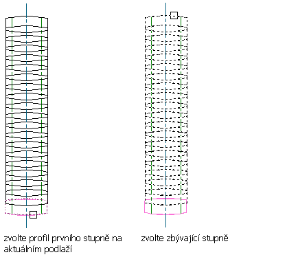 Tento postup použijte k vytvoření vlastního schodiště z profilů stupňů. Použijte definované profily, generované z uzavřených křivek, pro vlastní stupně schodiště. Všechny profily stupňů v každém schodišti mezi podlažími, se musí buď protínat nebo přesahovat.