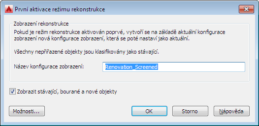 Zobrazí se dialog První aktivace režimu rekonstrukce a ve výchozím nastavení také název konfigurace zobrazení s předponou rekonstrukce.