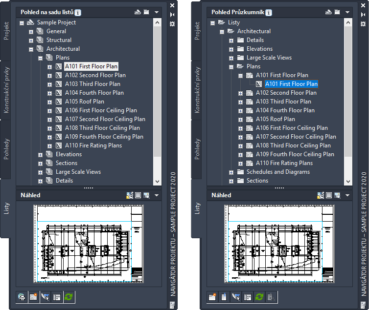 Karta List uvádějící Pohled sady listů projektu (vlevo) a Pohled průzkumníku (vpravo)