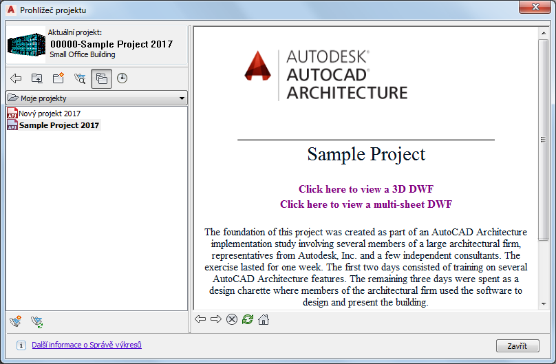 Prohlížeč projektu slouží k vytváření nových projektů, konfiguraci nastavení projektu a projektových norem, přidání detailních informací a výběru aktuálního projektu. Při nastavení aktuálního projektu z místní nabídky nebo dvojitým kliknutím na název souboru je projekt převeden do formátu kompatibilního s aktuální verzí aplikace AutoCAD Architecture toolset. Jestliže změníte také cesty projektu, převedou se i všechny soubory a nebude již možné otevřít projekt v jakékoliv starší verzi softwaru.