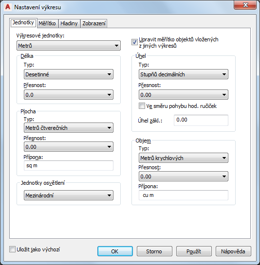 Zadání výchozích možností jednotek u aktuálního výkresu