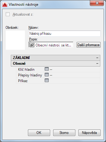 Ve výchozím nastavení není k nástroji příkazu přiřazen žádný obrázek. Chcete-li přidat obrázek znázorňující funkci nástroje, klikněte pravým tlačítkem do prázdné oblasti obrázku a vyberte obrázek. |