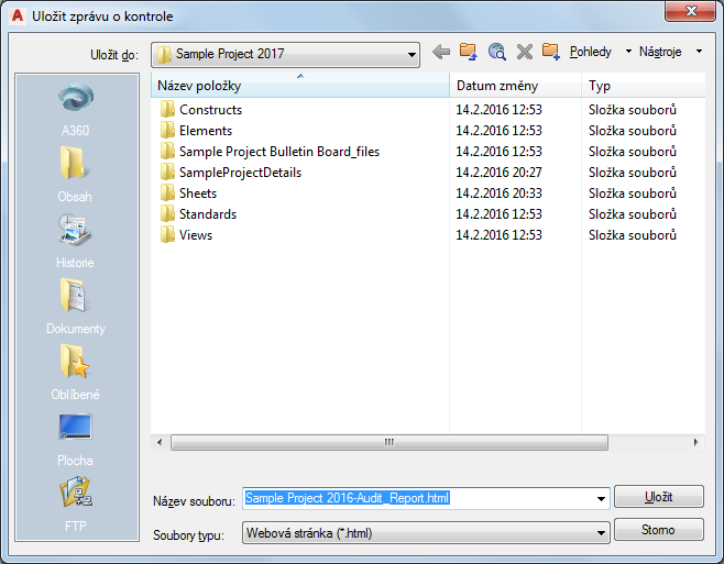 Když synchronizujete projekt nebo projektový výkres, můžete uložit protokol synchronizace ve formátu HTML nebo XML.