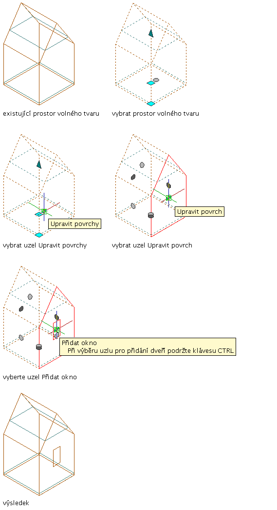 Poznámka: Jestliže se po ukončení režimu úprav povrchu otvory nezobrazí, nebyl aktivována komponenta zobrazení Povrchy ve stylu prostoru nebo ve vlastnostech zobrazení objektu prostoru.