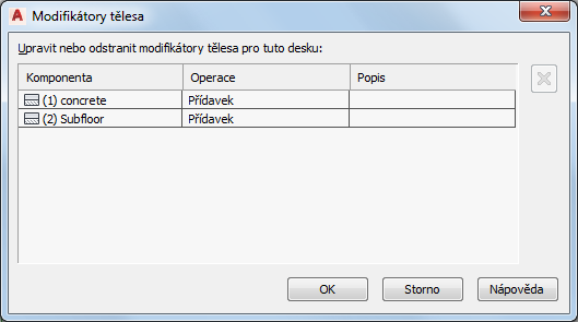 Tento postup slouží k úpravě nebo odebrání trojrozměrných (3D) modifikátorů tělesa z desky nebo střešní desky. Můžete změnit komponentu, ke které se přidává modifikátor tělesa, nebo způsob použití (zda se přičítá, odečítá nebo nahrazuje vybranou komponentu). Dále je možné zadat nebo upravit popisy úprav tělesa.