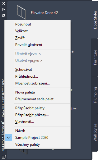 Skupina palet nástrojů projektu je uvedena pod dostupnými skupinami palet a může být vybrána.