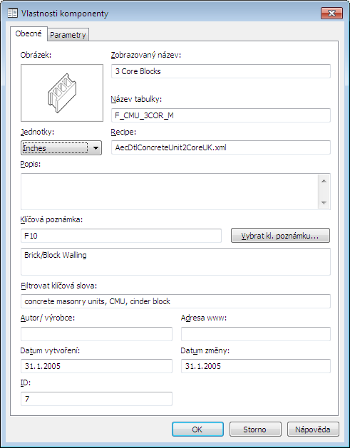 Tento postup slouží k úpravám vlastností jednotlivých komponent v rámci databáze komponent detailů. Vlastnosti na kartách Obecné a Parametry v dialogovém okně Vlastnosti komponenty představují základ pro jednu nebo více metod (recipe), které software používá ke kreslení komponent v různých pohledech. Každá metoda (recipe) určuje typ jig nebo postup při kreslení pro umístění komponenty ve specifickém pohledu. Metoda může obsahovat také informace týkající se hladiny a vzoru šrafování. Tento postup je také možné použít pro úpravy komponent ve výchozí britské a metrické databázi komponent detailů dodané se softwarem nebo k úpravám komponent v databázích, které vytvoříte.