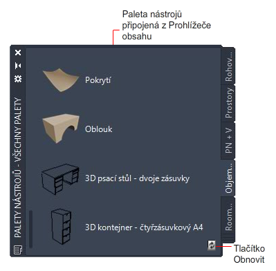 - Kliknutím na tlačítko Obnovit se provede aktualizace lokální palety nástrojů podle posledních změn v katalogu v Prohlížeči obsahu.