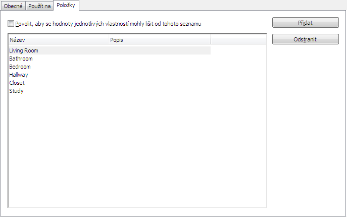 Definice seznamů jsou pojmenované seznamy pro prostory a zóny. Definici seznamu můžete připojit ke stylu prostoru nebo ke stylu zóny za účelem zajištění, že všechny prostory nebo zóny vložené s tímto stylem používají názvy ze seznamu. Definice seznamu lze vytvářet pro řadu účelů, například za účelem zajištění konzistentního pojmenování prostorů podle standardu budovy.