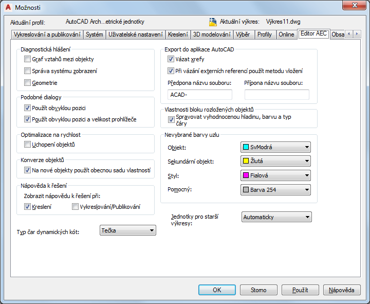Zadání výchozích možností nástroje Editor AEC u aktuálního výkresu
