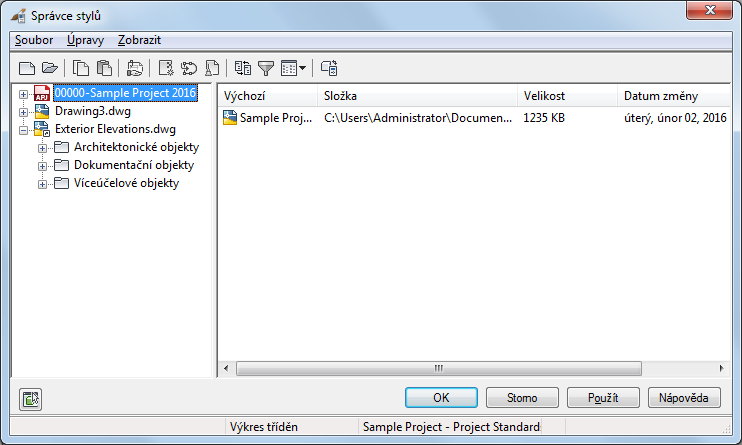 Tento postup použijte ke změně způsobu seřazení stylů ve Správci stylů. Ve výchozím nastavení jsou v levém podokně stromového zobrazení zobrazeny názvy otevřených výkresů a šablon. Jestliže rozbalíte výkres ve stromovém zobrazení, jednotlivé styly ve výkresech se seskupí do tří kategorií: Architektonické objekty, Dokumentační objekty a Víceúčelové objekty. Pokud rozbalíte kategorii, jednotlivé styly se uvedou v abecedním pořadí podle typu stylu.