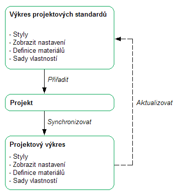 Projekt může být porovnán s projektovými standardy kdykoli v průběhu trvání projektu a pokud jsou nalezeny nesrovnalosti mezi standardy a projektovými výkresy, může být provedena synchronizace. Standardy mohou být navíc v případě potřeby aktualizovány z projektových výkresů.