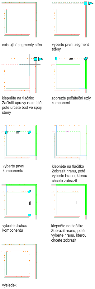 Tento postup slouží ke změně průsečíku stěny pomocí zobrazení dříve skryté hrany komponenty stěny.