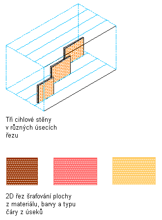 Když vytváříte úseky ve vašem stylu, obvykle chcete, aby objekty v nich byly vizuálně odlišné od ostatních úseků. Když přiřazujete materiály objektům, můžete nastavit styl 2D řezu tak, aby užil vzor šrafování z materiálu, ale barvu a typ čáry z vlastností zobrazení úseku.