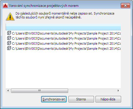 Při synchronizaci celého projektu budou výkresy, které jsou současně otevřené jiným uživatelem, nebo určeny pouze ke čtení vyloučeny ze synchronizace. Před započetím synchronizace projektu program spustí interní kontrolu pro zjištění, zda jsou v něm obsaženy výkresy, které nemohou být nyní synchronizovány. Pokud jsou takové výkresy nalezeny, zobrazí se tabulka upozornění.