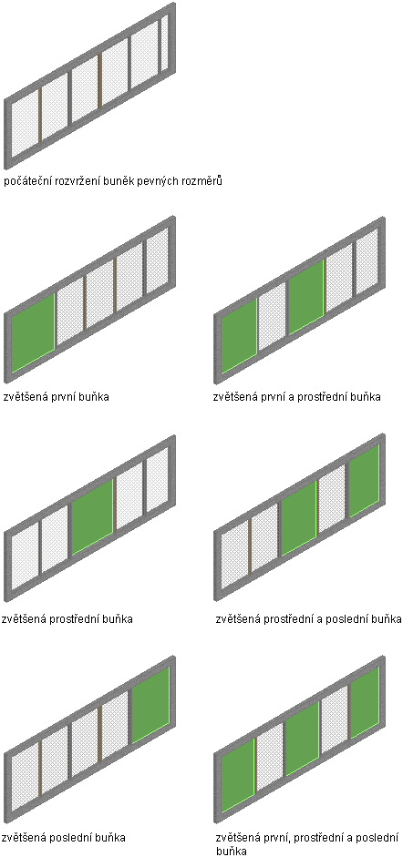 Rozdělení osnovy je možné automaticky upravit zadáním počáteční, prostřední a koncové buňky, nebo kombinací těchto buněk, čímž se získá přírůstek buněk. Velikost každé buňky závisí na vámi zadané kombinaci buněk. Na následující ilustraci jsou znázorněny všechny možné kombinace nárůstu buňky pro příklad sestavy dveře/okno s buňkami zvýrazněnými zeleně.