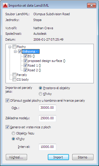 - V dialogu Importovat data LandXML vyberte možnosti importu.