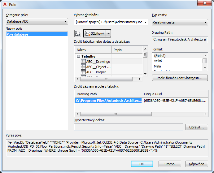 | vložit pole databáze do buňky tabulky aplikace AutoCAD |