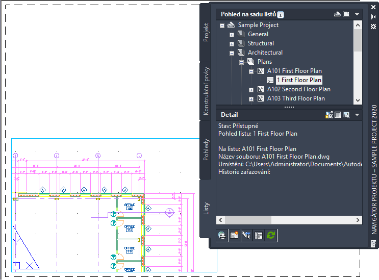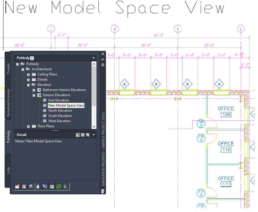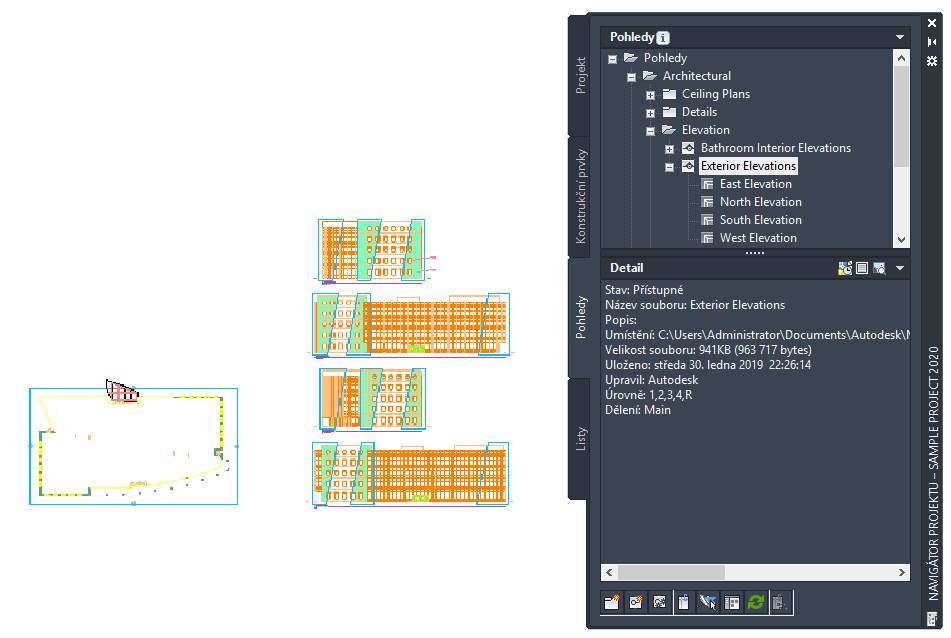 Výkres pohledu se vytváří výběrem konstrukčních prvků na paletě Navigátoru projektu a vytvořením reference na tyto prvky ve výkresu pohledu. Pokud vytváříte pohledy s více hladinami, každý konstrukční prvek je odkazován ve své relativní výšce hladiny, kdy nejnižší hladina je vložena na Z = 0.