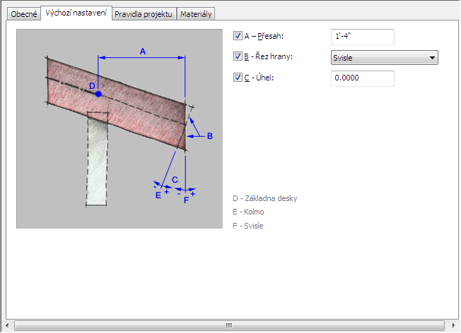 Tento postup použijte k určení výchozí hloubky přesahu, vyjmutí hrany a úhlu hrany pro hrany desek nebo střešních desek, používající styl hrany.