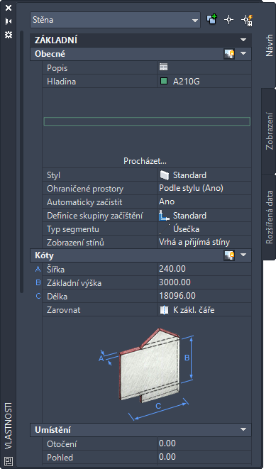 Paleta Vlastnosti pro standardní objekt stěny