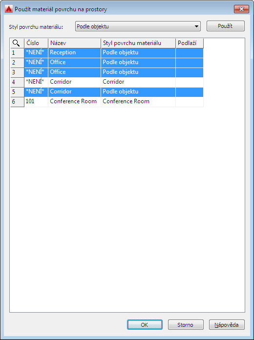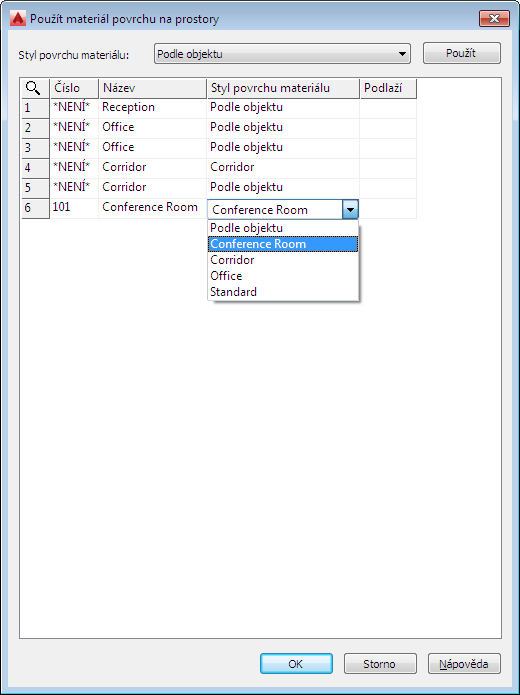 Všechny prostory výkresu jsou uvedeny v dialogu spolu s informacemi o jejich číslu, názvu a podlaží. Upravit lze pouze informace o stylu materiálu povrchu.