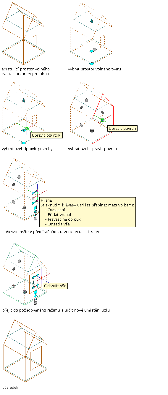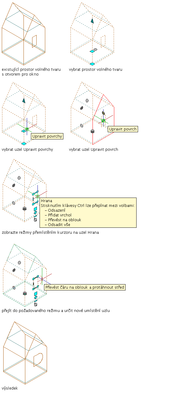 Otvory 3D volných prostorů je možné upravovat podobně jako kteroukoliv hranici aplikace AutoCAD Architecture toolset založenou na hranici. Hranice otvoru má uzly vrcholu a hrany pro účely generování požadovaného tvaru.