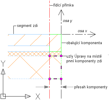 Často budete pracovat se styly stěny s jednou nebo více komponentami, které jsou v místě zakončení stěny nebo otvoru zalomeny. Například komponenta cihlové stěny je v některých stylech stěny zalomena v místě zakončení stěny. Řídicí čára rovnoběžná s osou Y v tomto případě vymezuje nejvnitřnější plochu komponenty. Zbývající komponenty ve stylu stěny budou začínat na této řídicí čáře a podél řídicí čáry se zobrazí počáteční uzly.